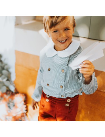 Elle revient cette saison dans un tissu à fines rayures vertes, avec toujours ce petit col blanc et ce double boutonnage qu’on adore !